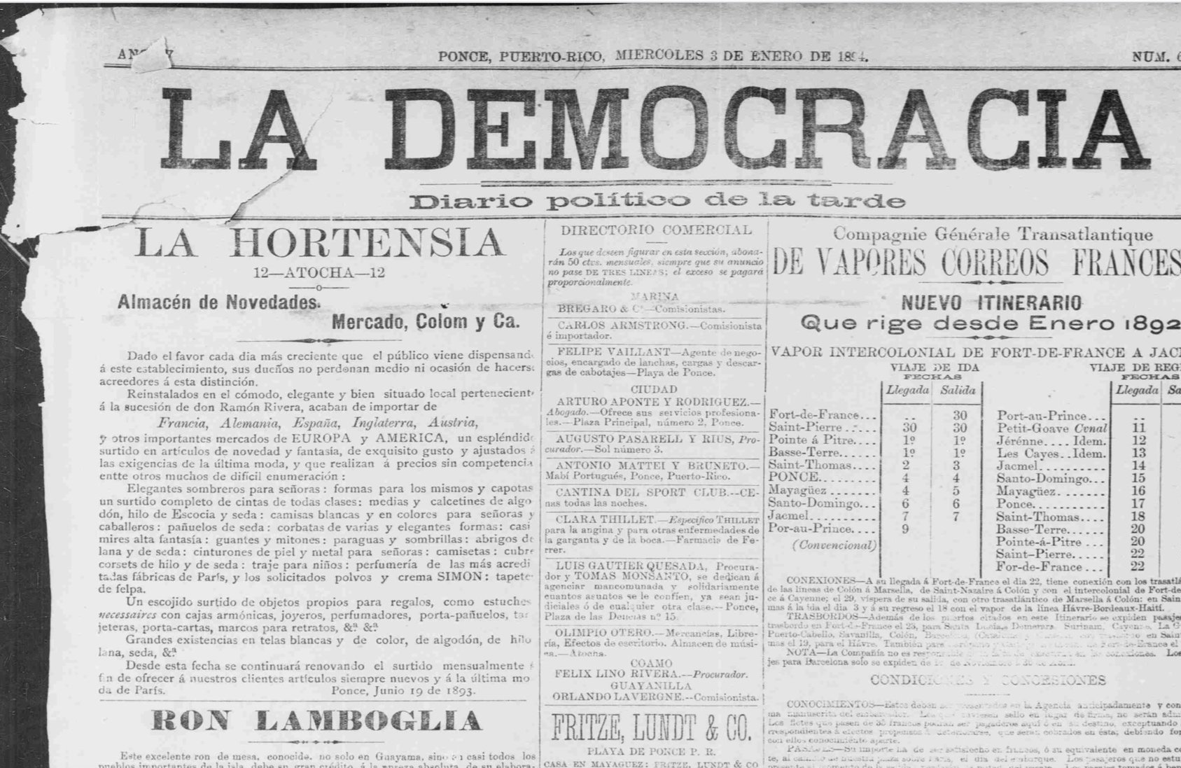 La Democracia. Diario Político de la tarde. Luis Muñoz Rivera, ed. Ponce, Puerto Rico. 2 de enero de 1894.
